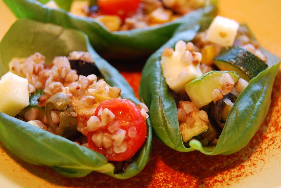 | 100g SIR GRILL 50 g buckwheat 1 Cucumber 10 pitted green olives 10 cherry tomatos onion salt black pepper fresh basil optional 1 tbs lemon juce olive oil big spinach leaves |