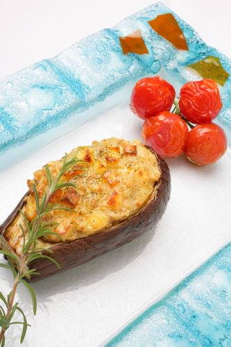 Cut off the top of the eggplant and halve it, lengthwise. Scoop out the pulp and season it with salt. Stuffing: Sauté chopped onion on butter and cool. Leave oat flakes to soak for half-hour until they become soft, add cooled onion, SIR-GRILL cut into cubes, bechamel sauce, egg and spices. Stir gently. Pat dry the eggplant, sprinkle with salt and spoon in the mixture. Sprinkle with Parmesan cheese, oil a baking dish and place the eggplant inside, bake for 20 min at 170°C. Serve warm or cold with any kind of sauce